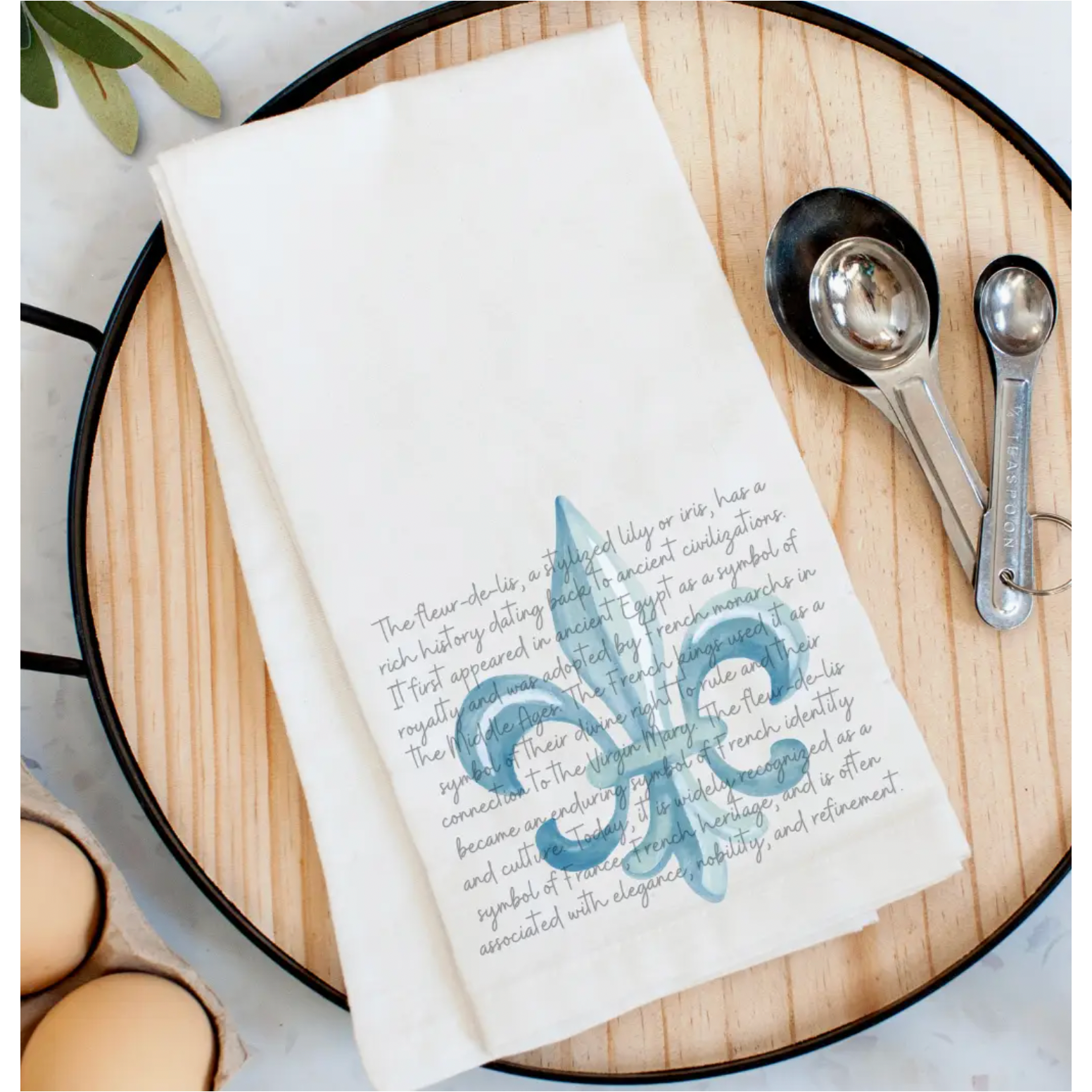 Elevate your kitchen decor with a touch of regal charm and historical significance. Our 27" x 27" Flour Sack Towel featuring a watercolor fleur-de-lis design is more than just a practical kitchen accessory; it's an exquisite work of art that tells the story of this iconic symbol. At the heart of this towel is a beautifully crafted watercolor fleur-de-lis, a symbol known for its grace, heritage, and significance. Surrounding the fleur-de-lis, you'll find carefully curated wording that delves into the rich history and meaning of this emblem.