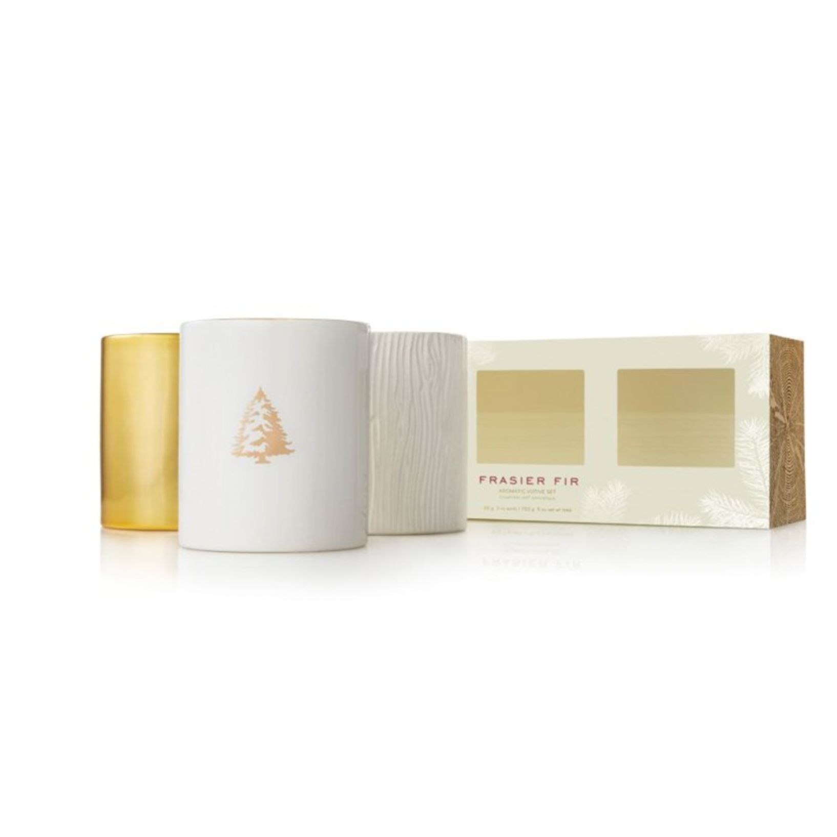 Bring the fresh scent of Frasier Fir into your home with this set of three assorted ceramic candles. The winter white, wood grain, and glistening gold designs complement each other perfectly, creating a cozy and festive atmosphere. These candles are perfect for adding a touch of holiday cheer to any room in your home.