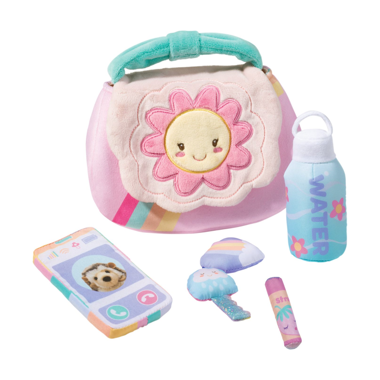 Let your little one take on the world of the grown ups with our engaging My First Purse set! This whimsical handbag and its assorted plush accessories are perfectly designed for small hands and big adventures! A visual caller ID reveals our plush Spunky the Hedgehog to be calling on the soft cell phone, while a cheerful applique flower peers out from the front flap of the purse with a warm smile. The cell phone, key fob, water bottle, and lip gloss all fit neatly within the tote and feature a playful rainbow and butterfly theme for a lighthearted feel. Our play set’s soft textures and engaging illustrations will appeal to toddlers and parents alike. Set them loose on hours of imaginative adventures, it’s fun to play grown up when you have a purse full of exciting accessories at your side!