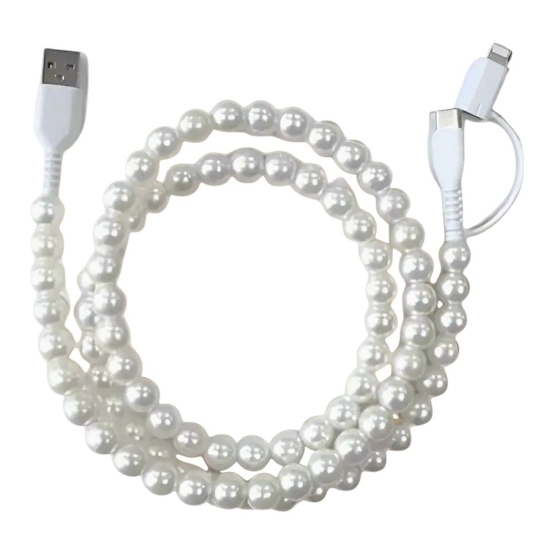 This ultra stylish phone charger makes other tech accessories look basic! Our pearl cord 2 in 1 phone charger is compatible with both iPhone and C type devices. Charge your device quickly and efficiently with this must-have accessory!