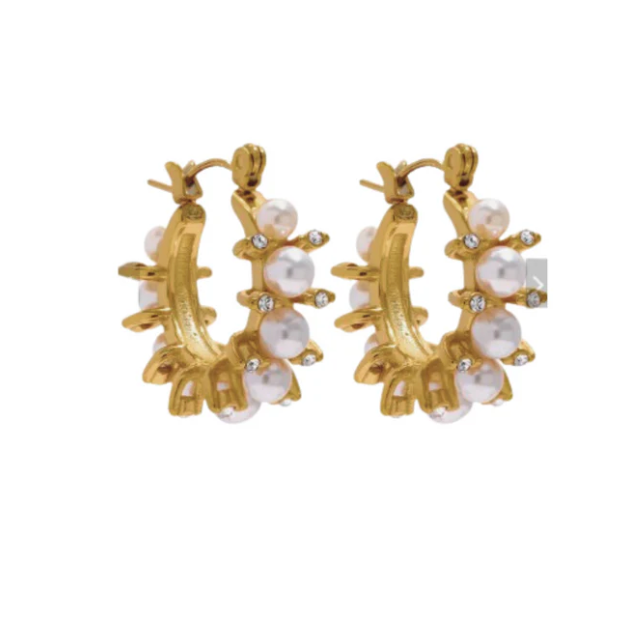 Main Material: 18k Yellow Gold Plated Stainless Steel, Water and Tarnish Resistant, 3/4", Simulated Diamonds and Pearl.